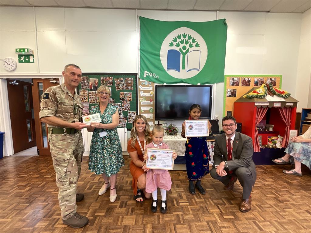 SSCE Cymru team members joined Mount Street Infants School in Brecon, Powys, to celebrate the first school in Wales to achieve the Gold Armed Forces Friendly Schools Cymru status.